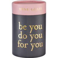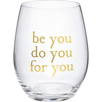 A stemless wine glass featuring a gold foiled "Be You - Do You - For You" typeset sentiment. Comes packaged in a high-quality cylinder box lending full design with metallic foil. Holds 15 oz.; hand wash only.