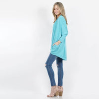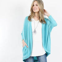Ash mint cocoon open cardigan that features flowing cape sleeves.