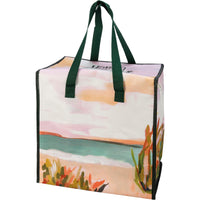 Made of post-consumer material, this double-sided insulated tote features abstract beach landscape designs and top "Beach Sweet Beach" sentiment. Keeps items hot or cold. Includes nylon straps and top zipper. Wipe Clean. California Residents see Prop 65 Notice