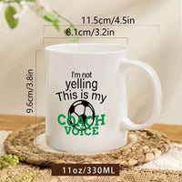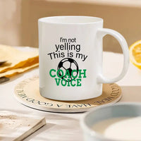 "I'm not yelling This is my COACH VOICE" and Soccer ball print on a a white ceramic mug.
