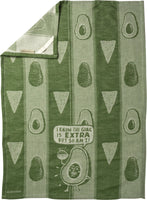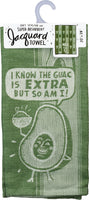 A cotton jacquard woven kitchen towel featuring an "I Know The Guac Is Extra But So Am I!" sentiment with avocado and tortilla chip designs. Machine-washable.