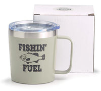 Stainless steel double wall cup with "fishin' fuel" message in black and has a fish in between the words. Has a clear lid and is individually gift boxed.