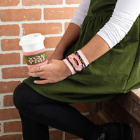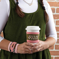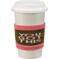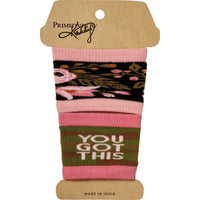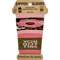 A set of two knit sipper sleeves to fit around any hot or cold beverage container. Featuring a coordinating color palette, one sleeve features a "You Got This" sentiment with camo design, and the other features a soft floral design.