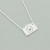Stainless steel adorable camera with hollow heart "lens" pendant necklace in silver or gold plated.