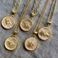 Gorgeous coin-shaped rose quartz pendant necklace accented with a golden bee.  The pale pink rose quartz is called the heart stone and is known for promoting universal and unconditional love. When combined with the beautiful bee, it makes the perfect gift for that loved one who respects nature and appreciates hard work.  Our diligent and determined bees amazingly produce honey that has been proven to ease our coughs and naturally sweeten our foods. They help pollinate our trees and plants and are crucial to our ecosystem and fresh food supply. Wear this necklace to remind yourself and others to always love and respect nature and protect our beloved bees!