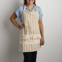 A charming accessory for fall, a cotton and polyester apron featuring a hand lettered "Give Thanks" front pocket sentiment and striped designs with adjustable neck and waist straps.
