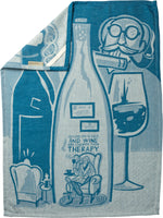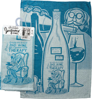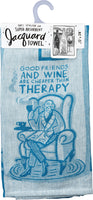 A cotton jacquard woven kitchen towel featuring a "Good Friends And Wine Are Cheaper Than Therapy" sentiment. Machine-washable.
