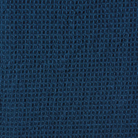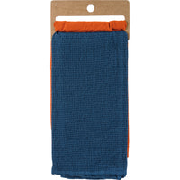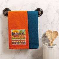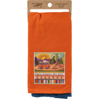 A set of two coordinating cotton kitchen towels. Towel one features a stitched art panel with "Happy Campers Live Here" sentiment and colorful wood burned designs on an orange base. Towel two features a blue waffle weave design. Our Happy Campers Live Here towel set is machine-washable.