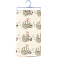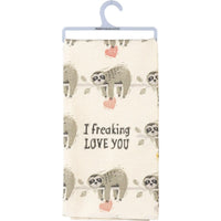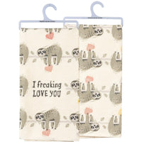 A cotton kitchen towel featuring an all-over block print sloth design and "I Freaking Love You" sentiment. Machine-washable.