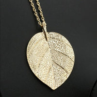 Leaf pendant measured approx. 2” x 1.5” Necklace is 27” with a 3” extender Rhodium plating over brass