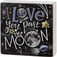 A wood home sign featuring chalk art night sky designs and hand lettered "I Love You Past The Moon" sentiment. Features subtle colored details and whitewashed sides for added interest. Easy to hang or can free-stand alone.