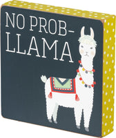 Add personality and character to any space with this wooden box sign, featuring a quilted llama design, playful "No Prob-Llama" sentiment, and glitter details. The No Prob-Llama sign is easy to hang or can free-stand alone.