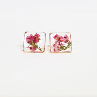 Handmade pressed flower earrings. Gold/silver plated square stud earrings featuring heather flower, preserved in crystal clear jeweler's grade resin. They are small and delicate, they only measure 1/2" (13mm.) Made in United States of America