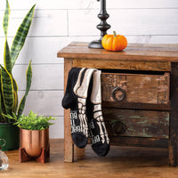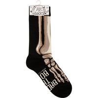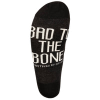These colorful socks feature woven skeleton leg designs with a hand lettered "Bad To The Bone" sentiment. Cotton, nylon, spandex. Our Bad To The Bone socks are one size fits most.