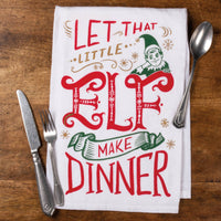 A festive cotton kitchen towel lending "Let That Little Elf Make Dinner" sentiment with elf character design and glitter accents. Machine-washable, glitter will not transfer.