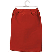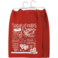 A red cotton kitchen towel featuring a hand lettered "Sugar Cookies" sentiment with an included recipe and chalk art sugar cookie-themed designs. Our Sugar Cookies kitchen towel is machine-washable.