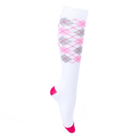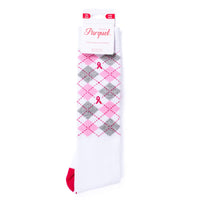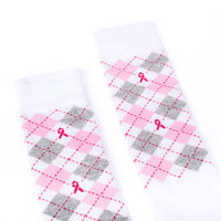 Elevate your sock game while showing your unwavering support for breast cancer awareness with our Ladies Knee High Breast Cancer Awareness Argyle Socks. These beautifully designed knee-high socks seamlessly blend fashion and advocacy, making them the perfect addition to any wardrobe.