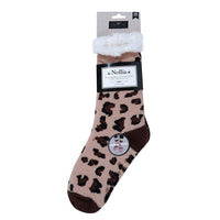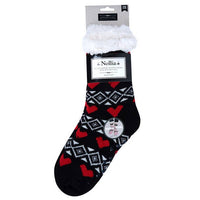 Women winter socks are made of 100% Polyester. Super thick fleece interior for maximum warmth and comfort. Non-skid bottoms to prevent slipping and sliding: Silicon rubber grips on soles of socks prevent slips and falls on smooth floors. One Size fits most Imported