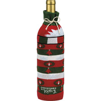 A creative alternative to a traditional gift bag, this washable and reusable knit bottle sock features a "To: Santa's Helper - From: Santa" sentiment with stripes and wreath, Christmas tree, and snowflake designs. Hangtag doubles as a gift tag.