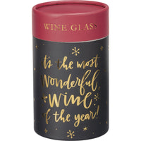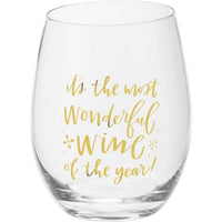 A chic stemless wine glass featuring a metallic hand lettered "It's The Most Wonderful Time Of The Year!" sentiment. Hand wash only; holds 15 oz. Comes packaged in a sturdy, high-quality cylinder box showing full design in metallic foil.