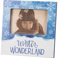 A wooden plaque frame featuring a snowfall design and "Winter Wonderland" sentiment. Fits a 6" x 4" photo. Includes easel back to free-stand.