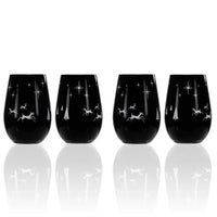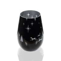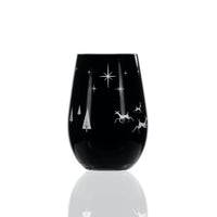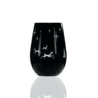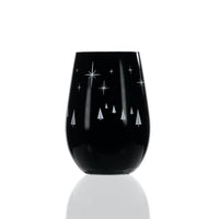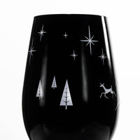 You can find “Wonderland" in this Mid-Century glass tumbler. This sheer rim universal glass is painted black and silver with stars, evergreen trees, and 3 enchanted deer engraved into the paint. Each element is thoughtfully placed around the glass revealing its silver lining. The glossy black and silver paint is fired onto the glass making it strong while holding its shine and color even after dishwashing. Whether you use the 16.5oz lead-free glass as a wine tumbler, cocktail glass or votive, you are sure to spread holiday cheer to friends and family of all ages.