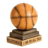Baseball, football, basketball, and soccer called to pray figurines attractively display a baseball, football, basketball, or soccer ball on a wood carved look base. Engraved around the base are the words of Philippians 4:13, "I can do all this through him who gives me strength." it's an inspiring gift for your favorite sports player! Made of resin; Dimensions: