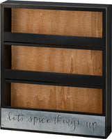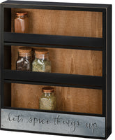 A wooden spice rack with a black stain featuring "Let's Spice Things Up" sentiment and three shelves for storing spices. Easy to hang or can free-stand alone.