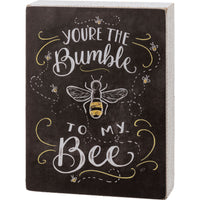 A wood home sign featuring bee designs and hand lettered "You’re The Bumble To My Bee" sentiment. Features subtle colored details and whitewashed sides for added interest. Easy to hang or can free-stand alone.