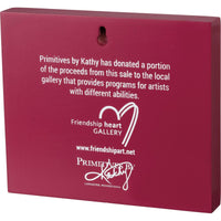 Replicated from original art created at the Friendship Heart Gallery in downtown Lancaster, PA by artists with intellectual disabilities and autism, this wooden box sign features abstract wing design with "Let Your Dreams Be Your Wings" sentiment. Hangs easily by predrilled keyhole slot or can free-stand alone.