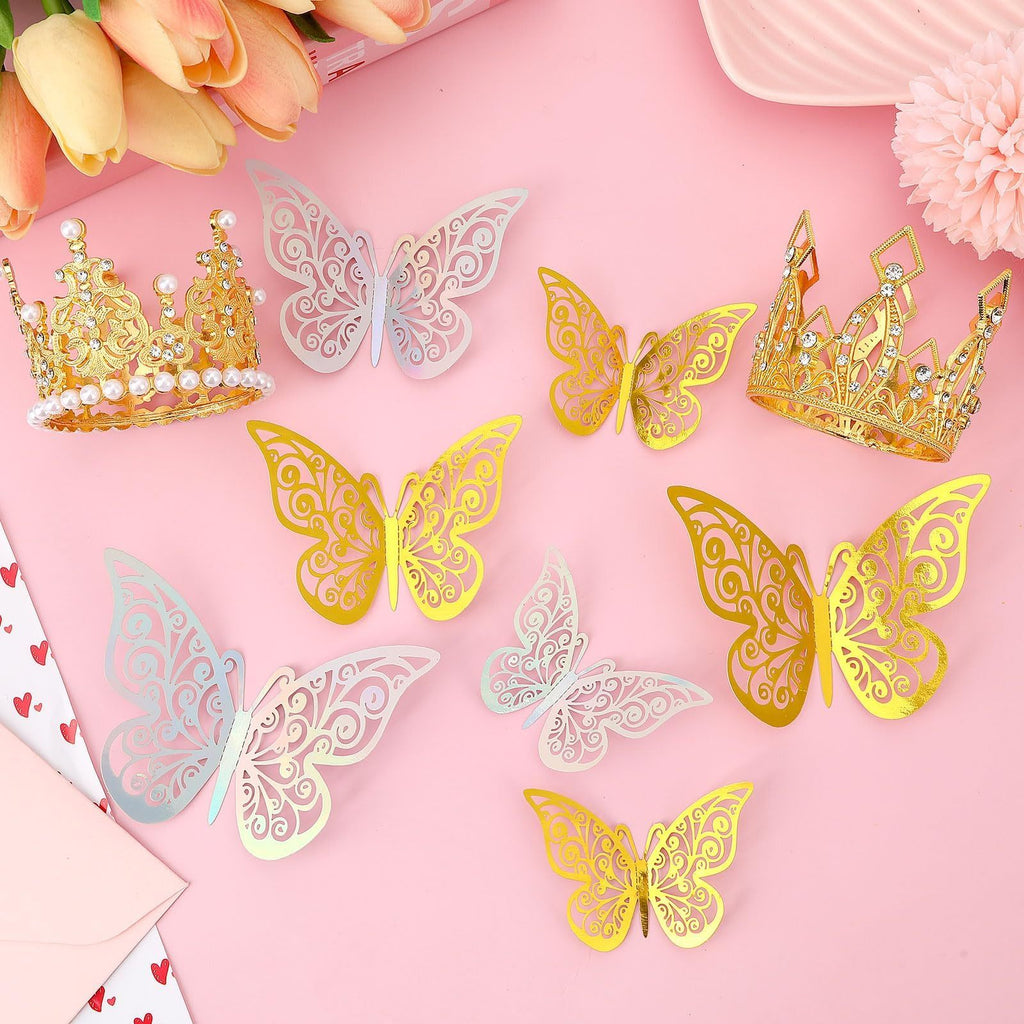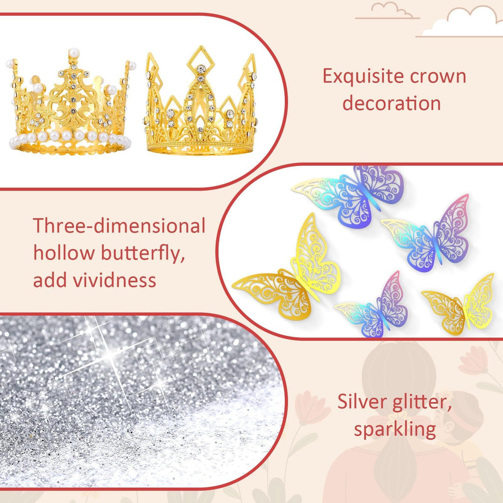 - What You Will Get: You will get 2 pieces of gold crowns for flower bouquets, 24 pcs 3D butterfly decorations in 3 sizes (12 golden and 12 colorful), and 2 tubes of silver glitter powder. Unique and exquisite design, adding a sense of luxury to your bouquet