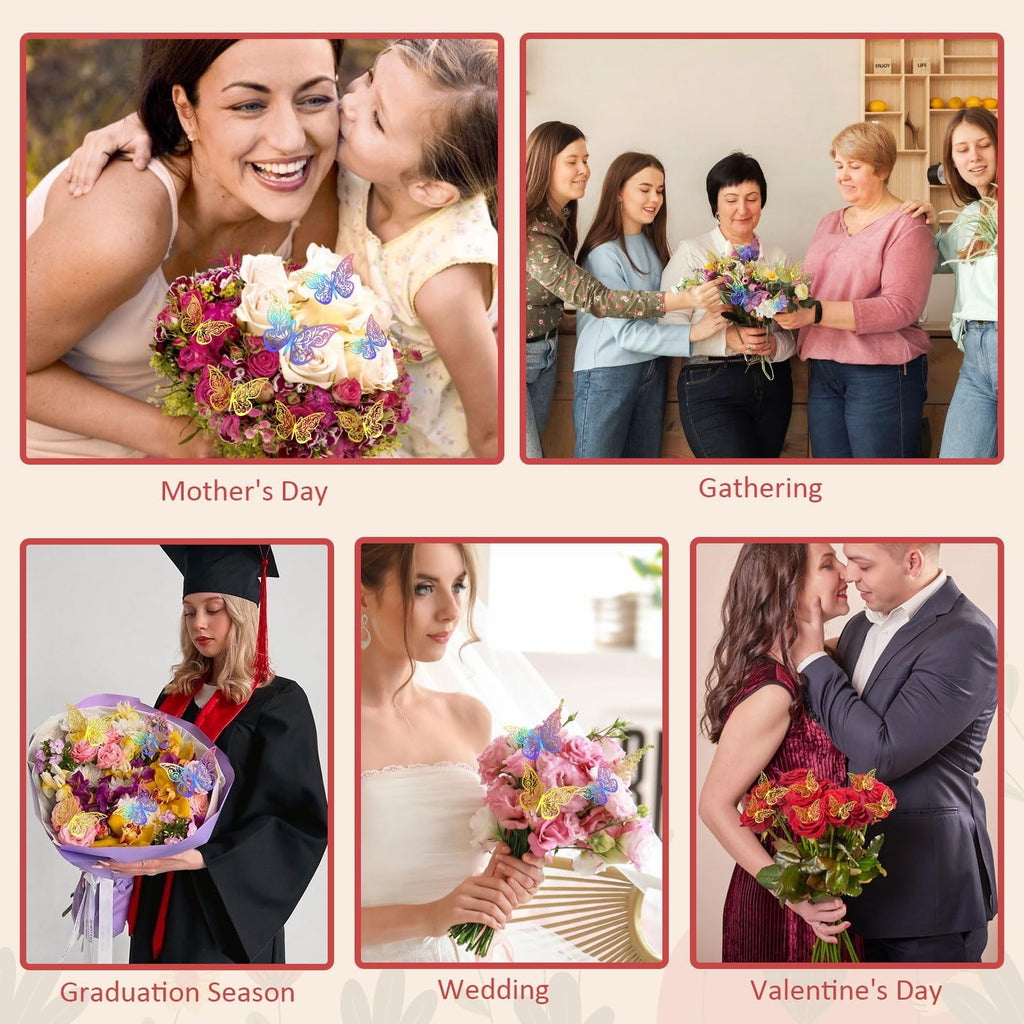 - 3D Butterfly Decorations: The crowns for flower bouquets set includes 24pcs 3D hollow butterflies, designed in 2 types: gold and dazzling, 12 pieces for each design. These butterflies are lifelike, as if dancing gracefully. Comes with 2 tubes of silver glitter powder, each tube weighing 6 grams. These glittering powders shine like stars, just sprinkle gently on the bouquet to add mystery and charm. When using glitter powder, apply some adhesive to the bonquet to make the glitter stick more firmly