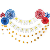 Detalles del producto: 1 paquete de 6 abanicos de flores de papel + 1 pancarta FELIZ CUMPLEAÑOS + 1 guirnalda