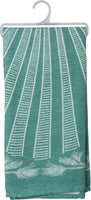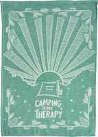Un paño de cocina tejido jacquard con diseños estampados, el mensaje "Camping Is My Therapy" e ilustraciones escénicas de tiendas de campaña. Lavable en la lavadora.
