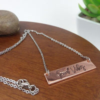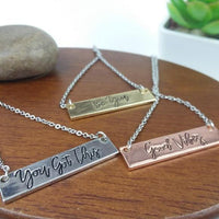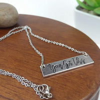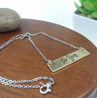 You Got This en un dije de barra en tono plateado, Be You en un dije de barra en tono dorado y Good Vibes en un dije de barra en tono dorado rosa. Cada uno en una cadena plateada de 16" con cierre de mosquetón.