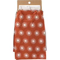Un juego de dos paños de cocina de algodón a juego. La toalla uno presenta el sentimiento "Soul Full Of Sunshine", diseños de sol y adornos de pompones naranjas. La toalla dos presenta diseños de sol en toda su superficie sobre una base naranja. Nuestro juego de toallas Sunshine se puede lavar a máquina. Las toallas se empaquetan en una percha de cartón con un orificio para colgarlas fácilmente en la rejilla.