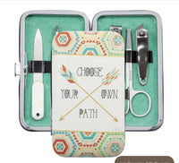 Un juego de manicura de 6 piezas en un estuche acolchado con ilustraciones bohemias y un sentimiento dulce e inspirador. Con obras de arte de Veronique Charron.