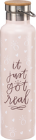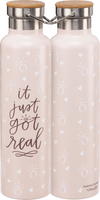 Una botella de agua aislada de acero inoxidable de doble pared con iluminación a juego y una capa superior de bambú. Presenta un sentimiento de "It Just Got Real" y un patrón de corazón y anillo en toda su extensión. Mantiene las bebidas frías durante 24 horas y calientes durante 12 horas.