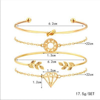 Juego de 4 pulseras. ¡Se pueden usar solas o juntas para una apariencia moderna en capas! El brazalete de hoja y el brazalete de nudo son ajustables. Las pulseras de piedras preciosas de diamantes tienen longitudes extendidas. Vea la última imagen para ver las medidas.