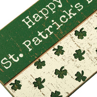 Un adorno rústico de madera con diseños de tréboles grabados y el mensaje "Feliz día de San Patricio". Cuenta con un lazo de alambre trenzado para colgarlo fácilmente.