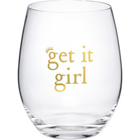 Una copa de vino sin tallo con un sentimiento tipográfico "Get It Girl" laminado en oro con diseño de pestañas. Viene empaquetado en una caja cilíndrica de alta calidad que brinda un diseño completo con lámina metálica. Capacidad para 15 onzas; Lavar a mano únicamente.