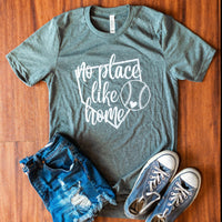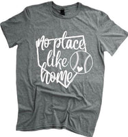 Ce t-shirt gris à manches courtes est absolument inspiré par l'amour du jeu !! Imprimé avec un message « No Place Like Home », un marbre et un ballon de baseball (ou softball) avec un petit cœur. Le t-shirt est composé à 52 % de coton/polyester.