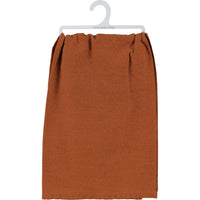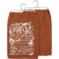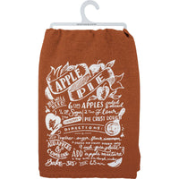 A brown cotton kitchen towel from our Fall & Harvest Collection displaying a design of an apple pie recipe hand illustrated in a chalk art style. Our Apple Pie Recipe kitchen towel is machine-washable for convenient cleaning. A charming and functional seasonal kitchen accent.