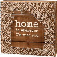 Une boîte en bois à lattes avec une œuvre d'art tendue à la main avec un motif de maison vide au centre et le message « Home Is Wherever I'm With You ». Piètement en bois naturel. Facile à accrocher ou peut être posé seul.