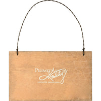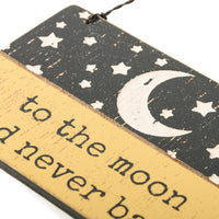 Une décoration en bois à lattes présente le sentiment « To The Moon And Never Back », une palette de couleurs marron et bleu, ainsi qu'un motif de lune et d'étoiles en creux et s'accroche facilement par une boucle métallique torsadée.