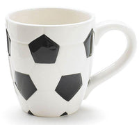 Mug de football avec coutures marron et blanches sur le devant pour ressembler à un ballon de football. L'intérieur est blanc et la poignée est verte.