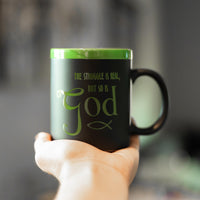 Tasse de tableau de 11 oz, la lutte est réelle mais Dieu aussi, vert