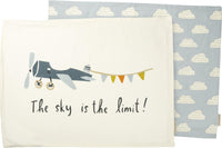 Un ensemble de deux taies d'oreiller en coton double face présentant une palette neutre. L'un présente "The Sky Is The Limit!" sentiment avec l'avion à réaction et les autres caractéristiques d'un design cloud intégral. Lavable en machine. Une partie de notre collection exclusive Happy + Bright. Les textiles sont sans phtalates ni colorants AZO.