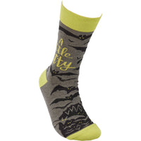 A pair of colorful woven socks from our Halloween Collection displaying a unique hand illustrated design of bats with humorous "A Little Batty" sentiment. Socks feature a one size fits most design made with cotton, nylon, and spandex. Our A Little Batty socks come with a header card and a clear plastic hanger for display. A fun seasonal accessory perfect for self-expression or for gifting.